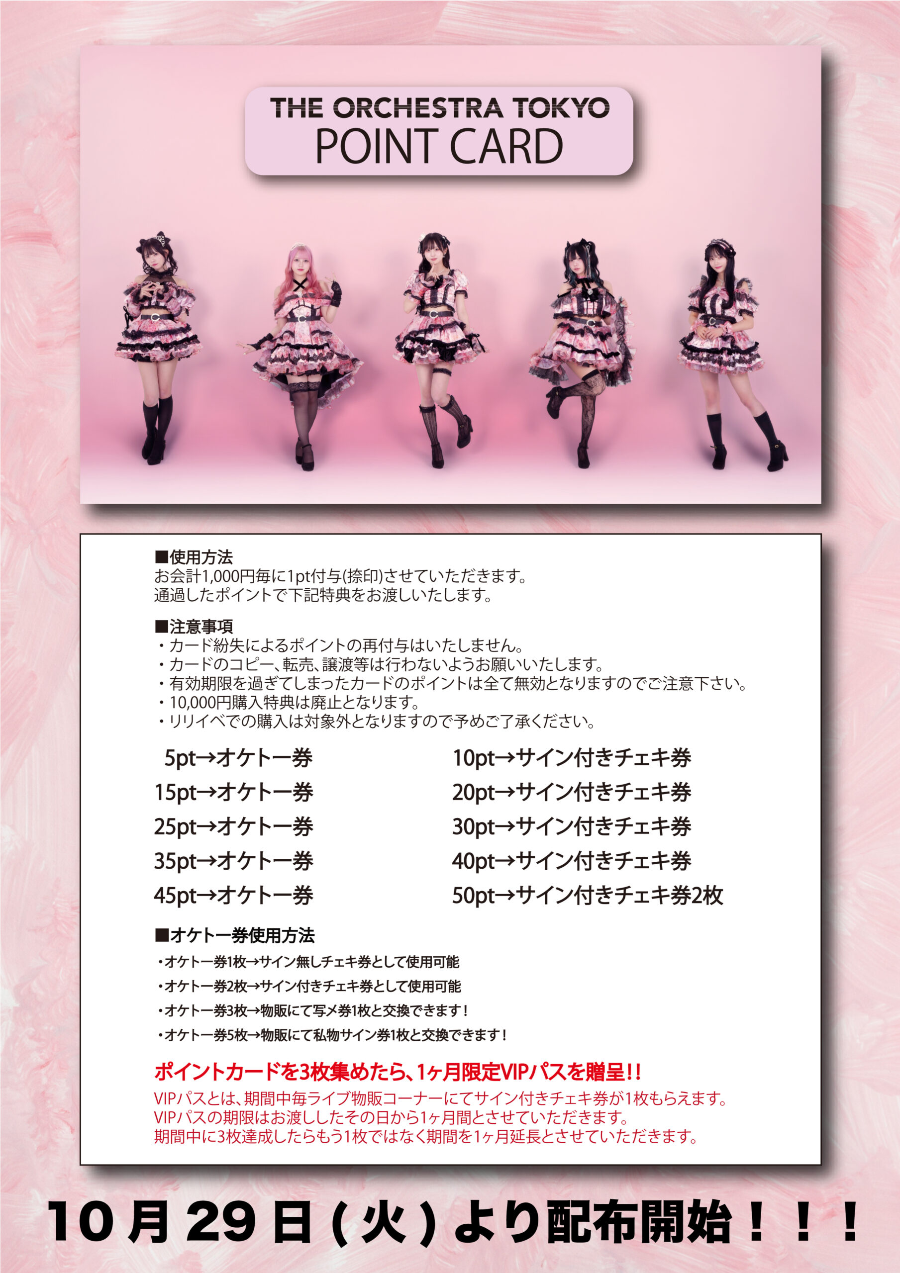 10月29日よりポイントカード実施! 2024.10.27 NEWS チェキ券価格改正に伴い、少しでもお客様の負担を減らせるよう10月29日よりポイントカードを実施いたします。 内容は画像をご参照ください。 URL Copied!
