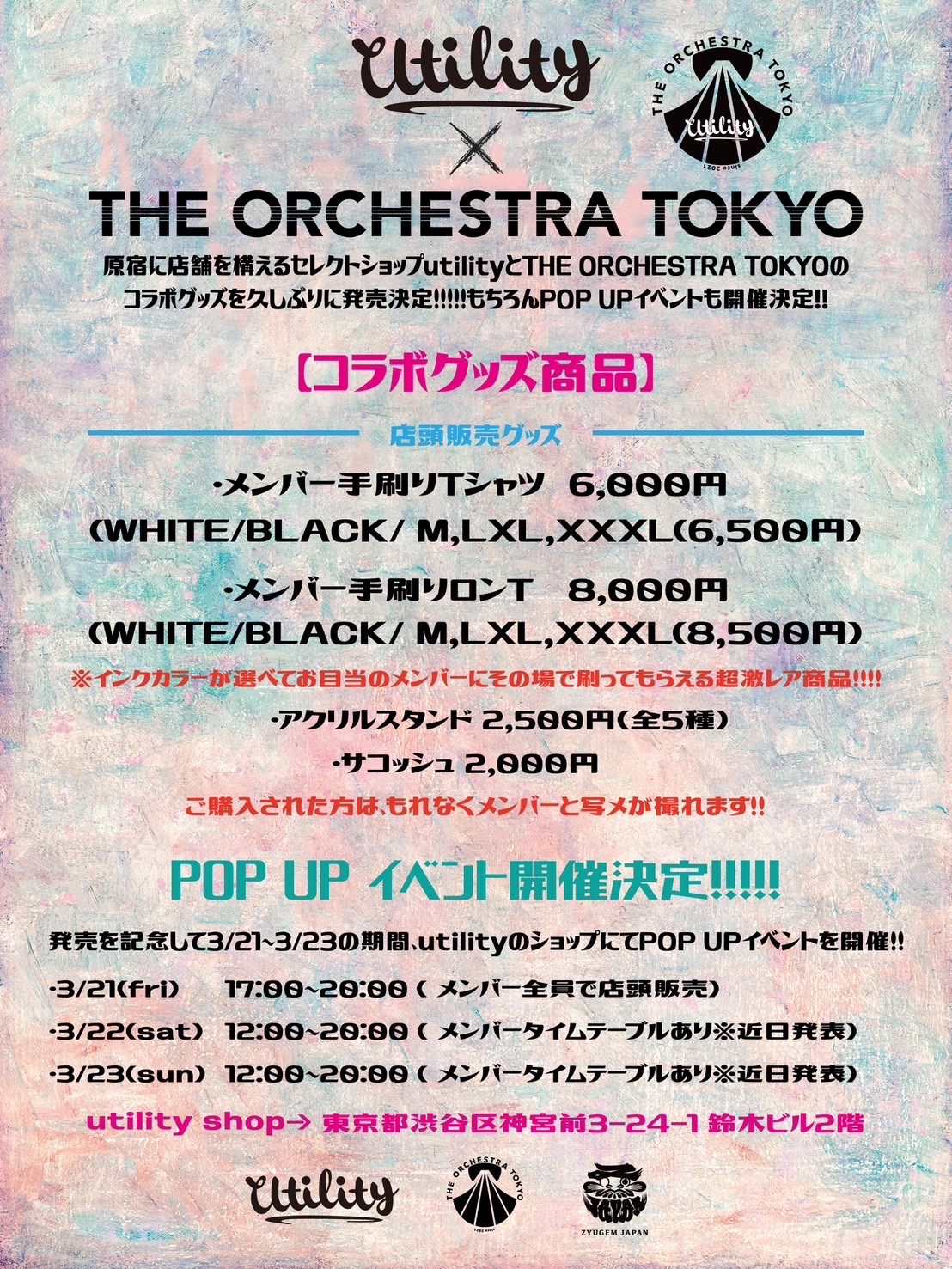 utility × オケトー コラボ第3弾 2025.03.03 NEWS グッズ utility × オケトー /2年半ぶりにコラボイベントが帰ってくる!\ utilityとTHE ORCHESTRA TOKYOのコラボグッズ第3弾を販売することが決定!さらに!発売を記念して3/21(金)〜23(日)でPOP UPイベントを開催します。メンバーも店頭に立ちますので是非!詳細は画像をチェックしてください。 今回のグラフィックアーティストもマシューマロー氏に依頼しました!フロントデザインもお楽しみに。 URL Copied!